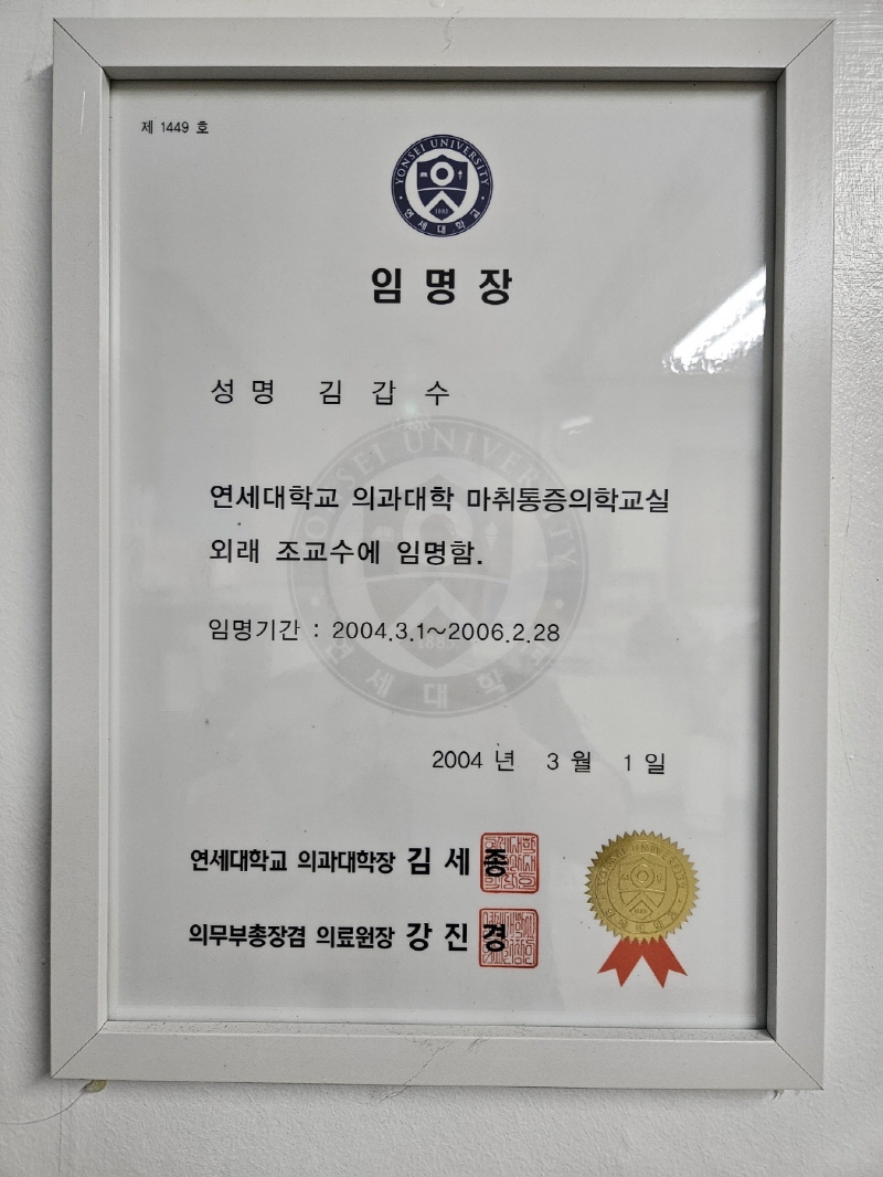 연세대학교 외래조교수 임명장 (04년~06년) 페이지 정보 작성자 최고관리자 댓글 0건 조회 9회 작성일 25-03-20 15:43 목록 본문 연세대학교 외래조교수 임명장 (04년~06년) 이전글증식치료교육이수증 25.03.20 다음글연세대학교 의과대학 위촉장 (10년~12년) 25.03.20 댓글 0 댓글목록 등록된 댓글이 없습니다.